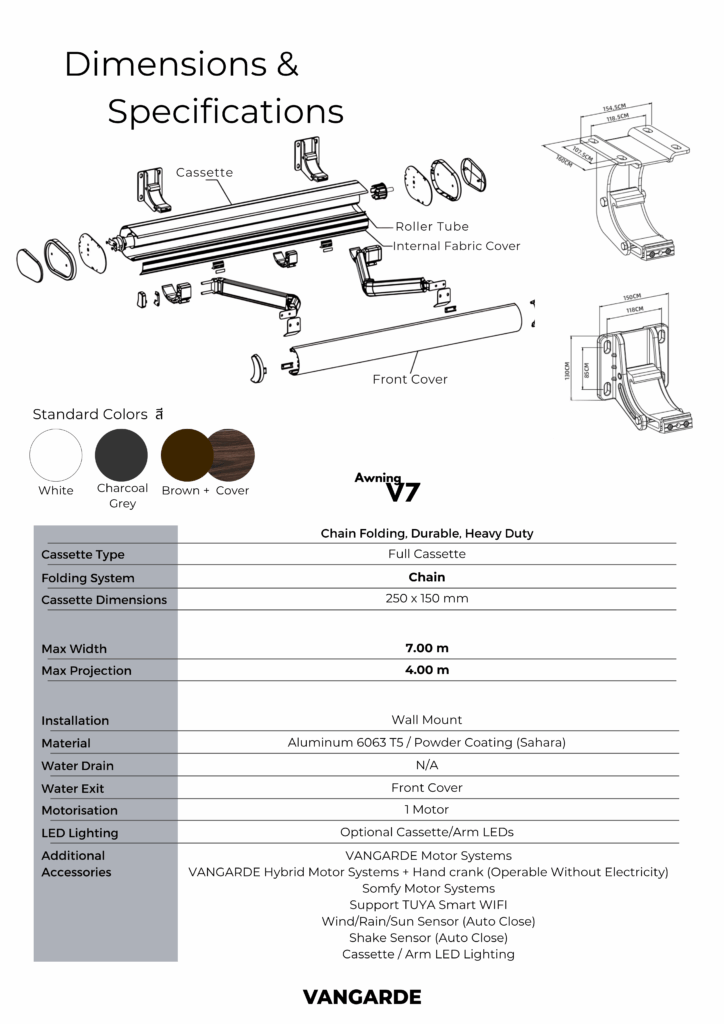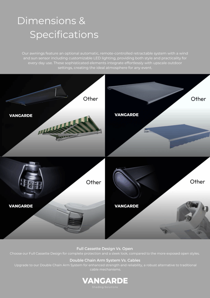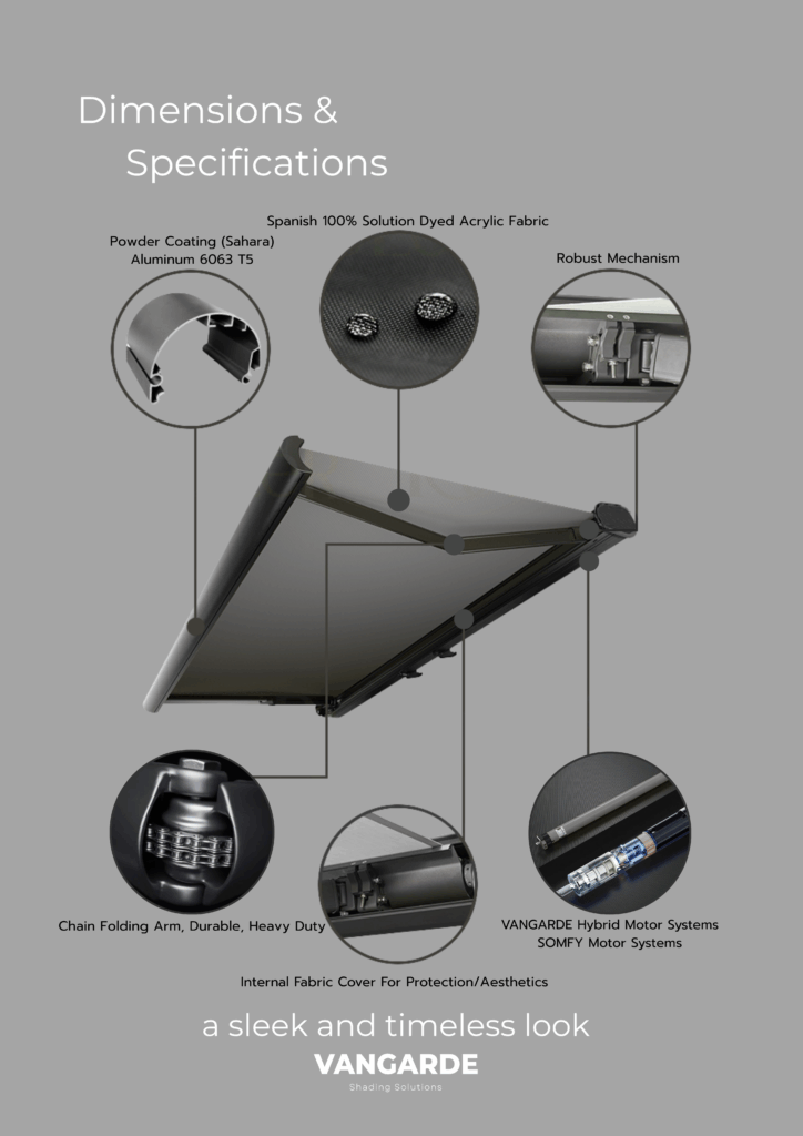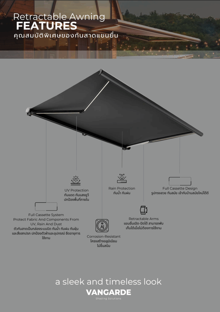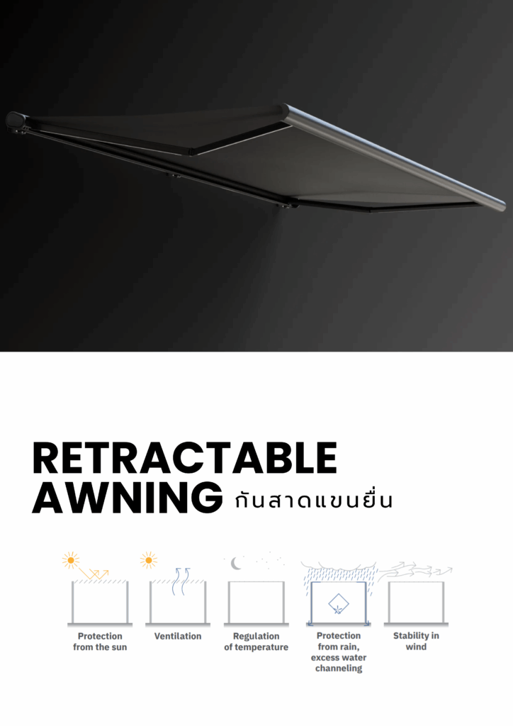 กันสาดระบบไฟฟ้า เปิด-ปิดได้ตามความต้องการใช้งาน เปิดใช้งานเฉพาะเวลาที่ต้องการใช้ เพื่อบังฝนและแสงแดด ปิดเก็บเมื่อไม่ต้องการใช้ ไม่เสียพื้นที่หรือบดบังสายตาเหมือน หลังคาหรือกันสาดทั่วๆไป มาในรูปแบบ Full Cassette เพื่อปกป้องผ้า อุปกรณ์และระบบกลไกต่างๆจากแสงแดดและฝน ช่วยยืดอายุการใช้งาน และคงความสวยงามของตัวบ้านไว้
