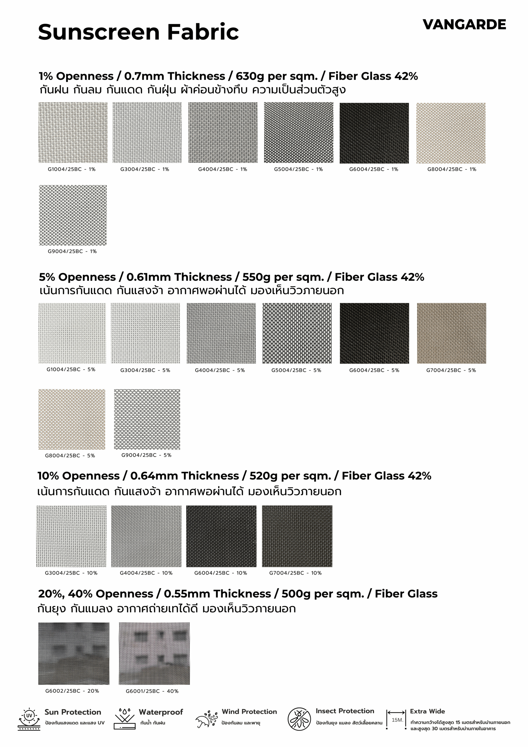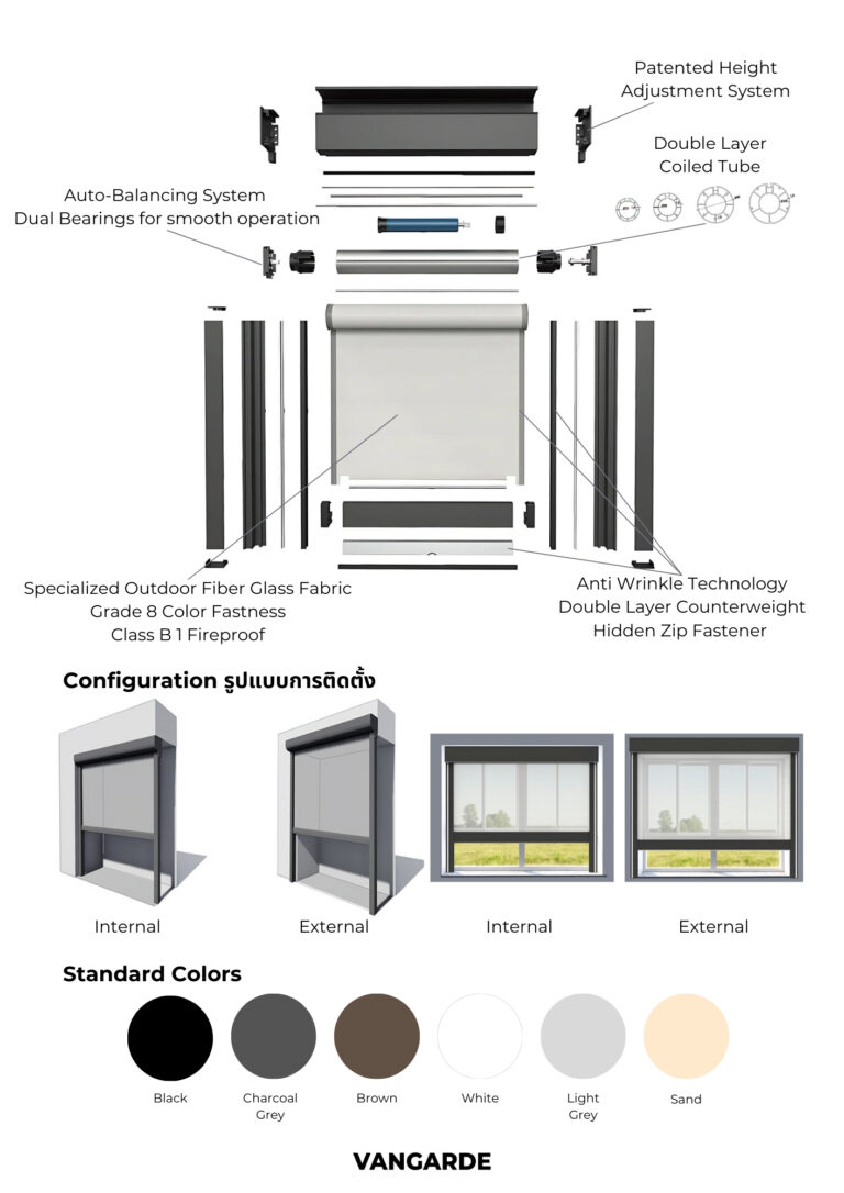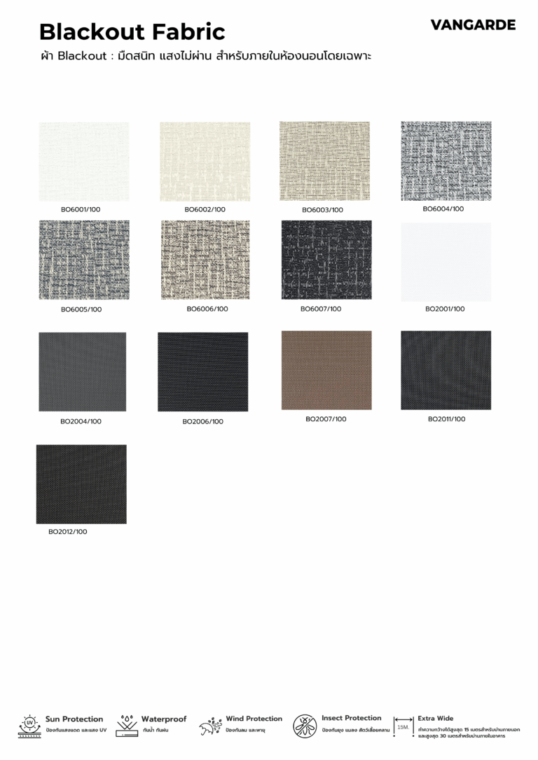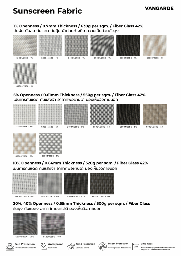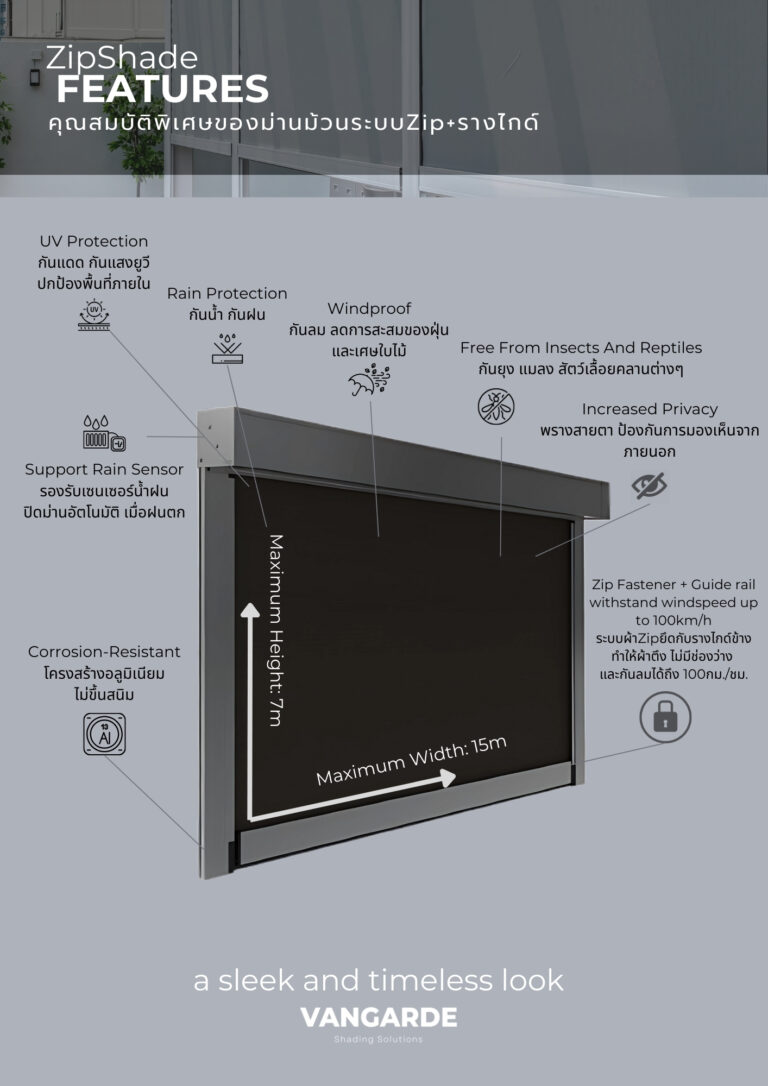 Zip Shade Zip Shade ม่านม้วนระบบล็อคข้าง ม่านม้วน ZipShade สำหรับ Outdoor โดยเฉพาะ ด้วยแเทคโนโลยี ผ้า Zip และรางไกด์ยึดด้านข้างทําให้สามารถรับแรงลมได้ถึง 100 กิโลเมตร/ชั่วโมง กันน้ำ กันฝน แดด ฝุ่น แมลง และสัตว์เลื้อยคลานต่างๆ มีตัวเลือกผ้าหลากหลาย เพื่อให้ตรงกับความต้องการ Collections
